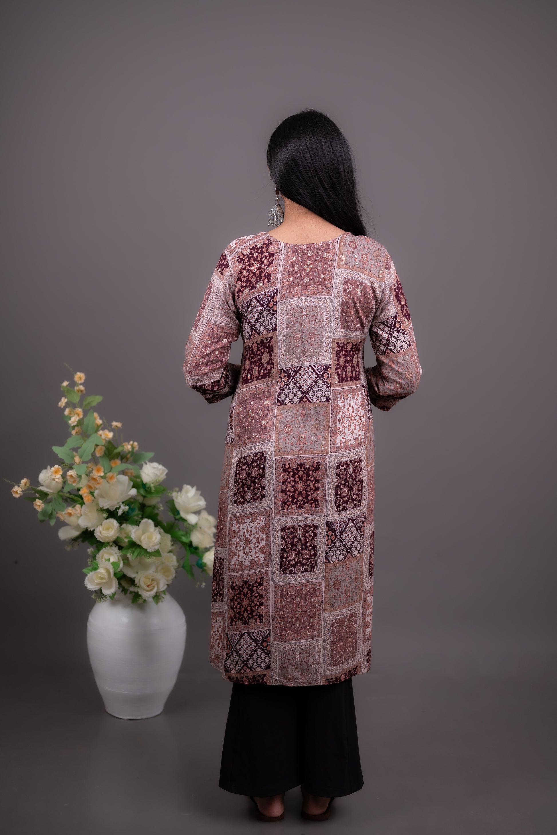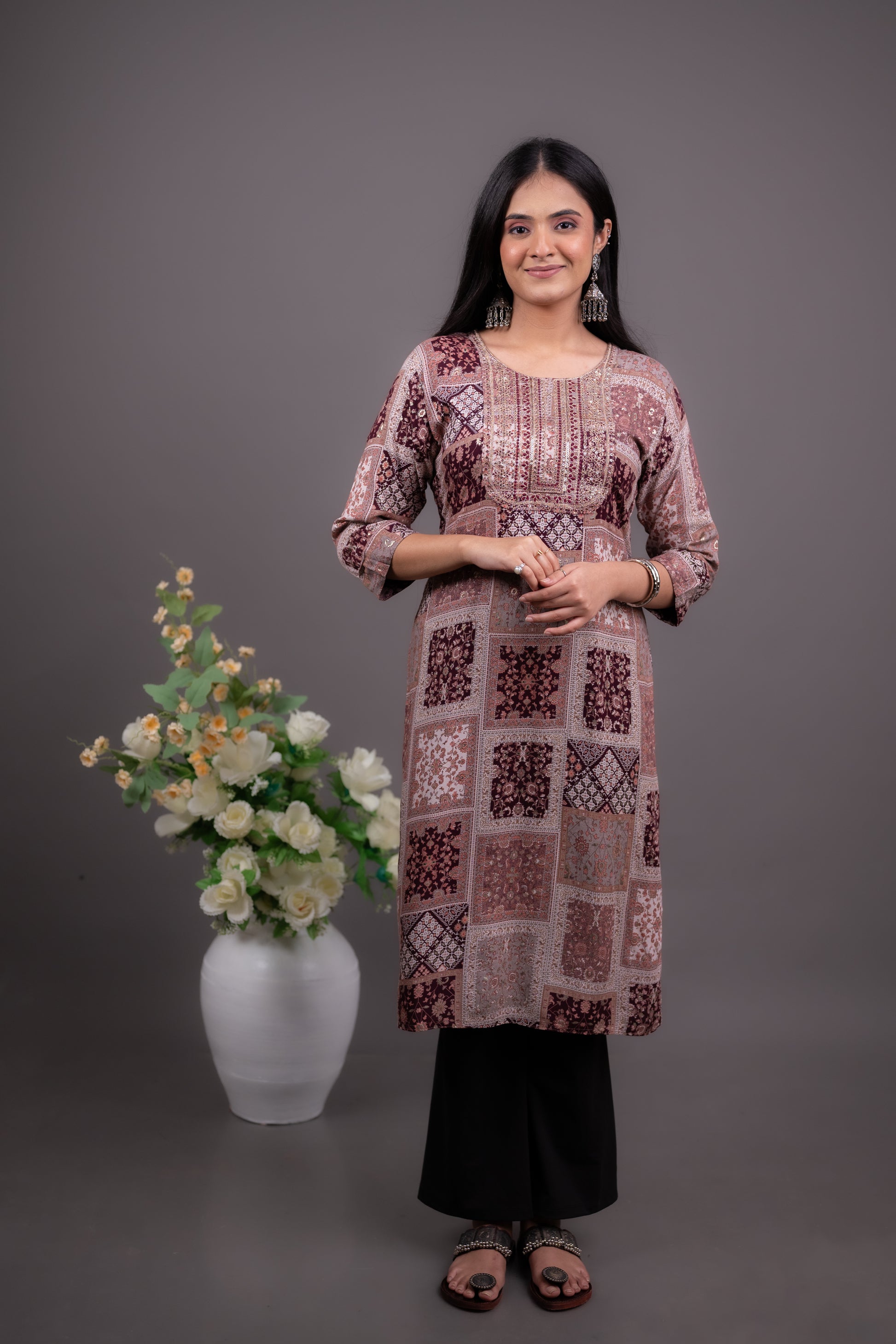 This elegant burgundy kurti features intricate ethnic block prints enhanced with sparkling gold threadwork and sequins, creating a timeless and sophisticated design. Made from premium fabric, it offers a comfortable fit and a flattering silhouette. The three-quarter sleeves and round neckline add to its classic charm, making it perfect for festive occasions or casual gatherings. Pair it with statement earrings and bangles to complete your look.
